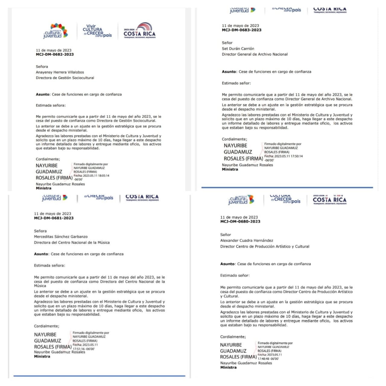 En los cuatro documentos idénticos de despido, de los cuales La Nación tiene copia, Guadamuz destituyó a los directores bajo el argumento de un “ajuste en la gestión estratégica que se procura desde el despacho ministerial”. Además, les solicita un informe de labores en un máximo de 10 días.