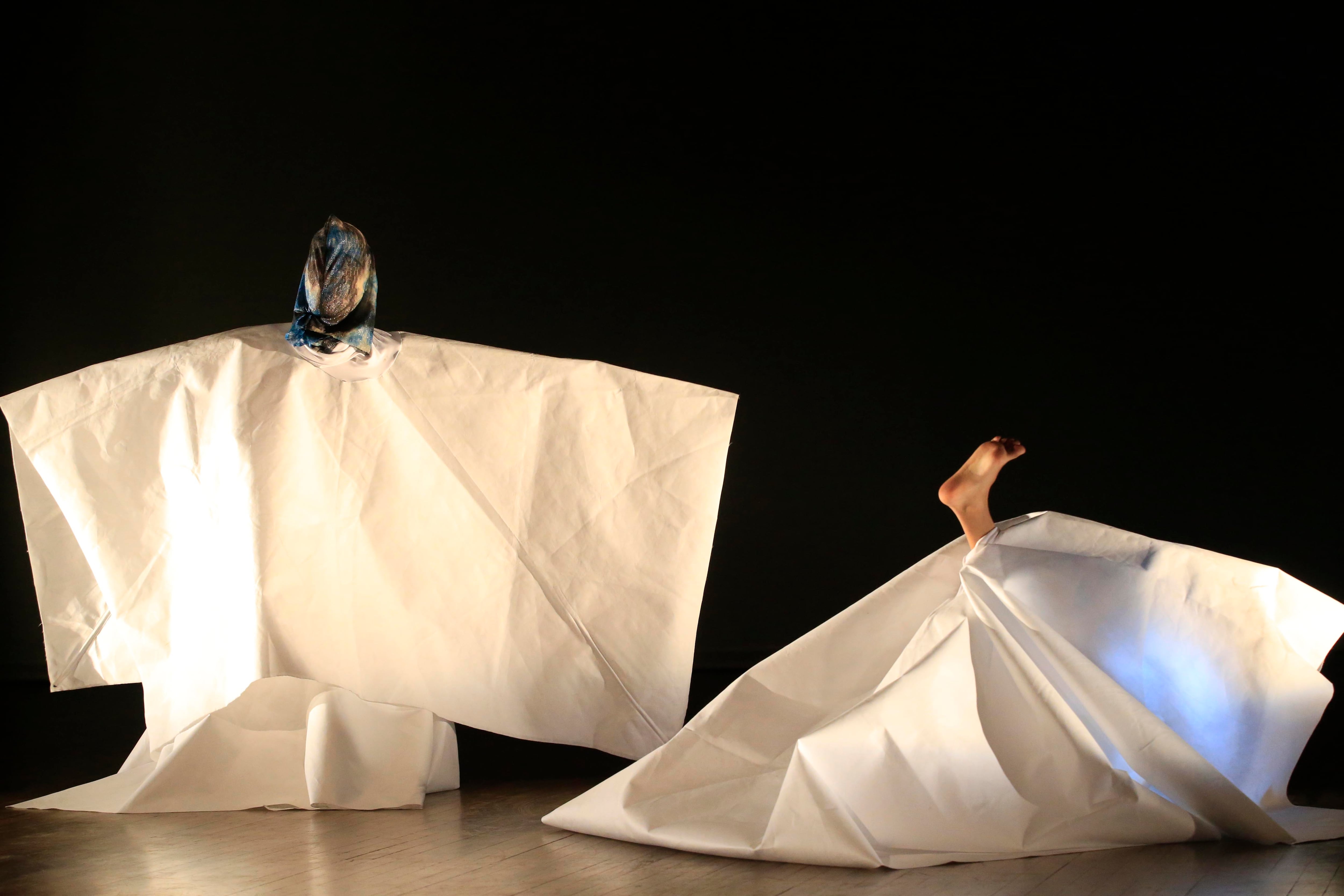 En un primer segmento, dos bailarines trabajan con pesos colocados alrededor de sus cuerpos. Más adelante, tres de ellos tienen que manipular unas extensas faldas blancas como si fueran papel de "origami", como lo llama López.
