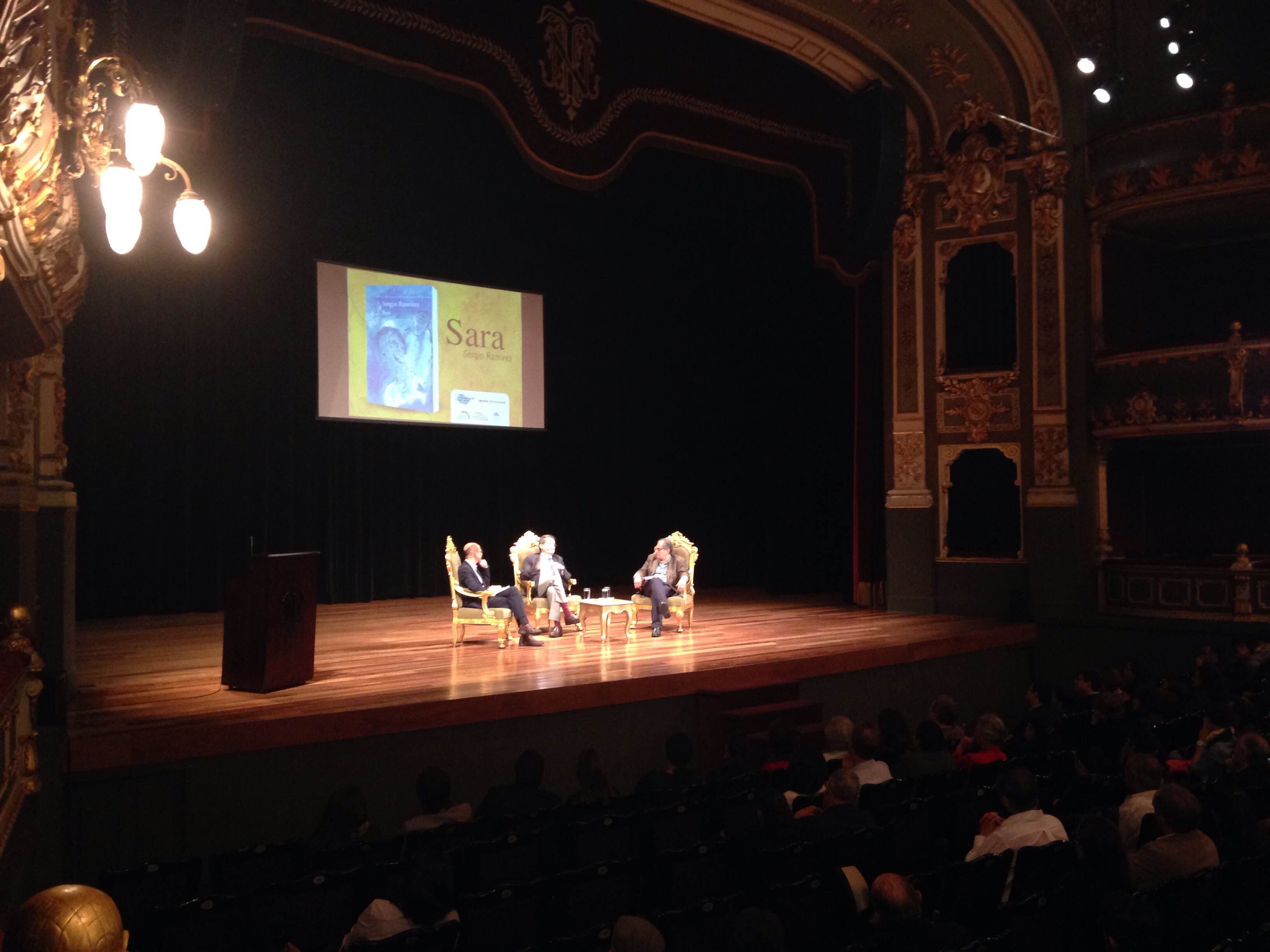El escritor nicaragüense Sergio Ramírez presentó en el Teatro Nacional su última novela, Sara. La actividad se realizó como parte de la XVI Feria Internacional del Libro, en un conversatorio en compañía de los autores Miguel Huezo-Mixco (Honduras) y Carlos Cortés (Costa Rica).