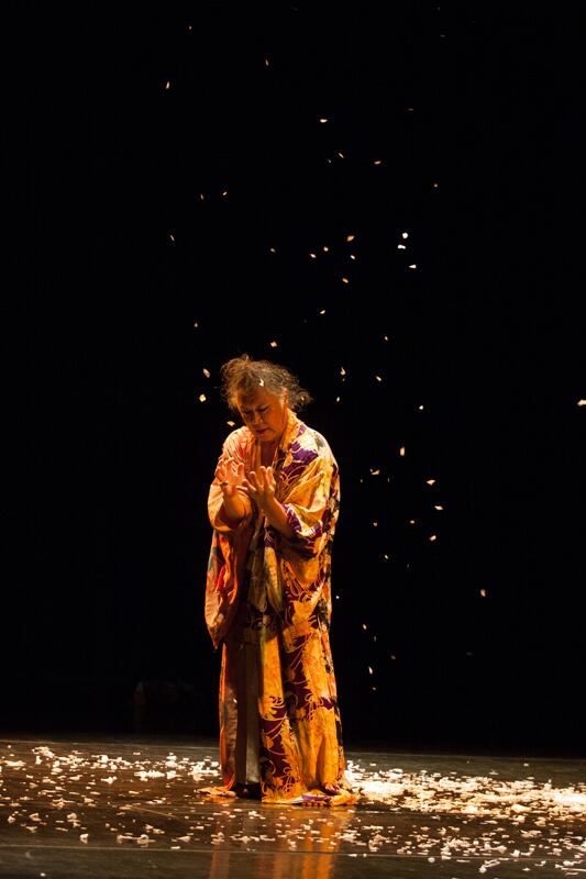 Al principio de Fukushima, mon amour , los movimientos de Tadashi Endo son mínimos. Los dedos mariposean en el aire; la mano se eleva y colapsa; el artista, de espaldas, se hunde en el silencio. Para cuando termina, él y la audiencia han sido hipnotizados por el horror del terremoto del 2011 en Japón y el desastre nuclear posterior; luego, son llevados a la luz a través del cuerpo del maestro del butoh. En el centro del escenario, la nieve cae, el tiempo pasa y la vida florece, una vez más.