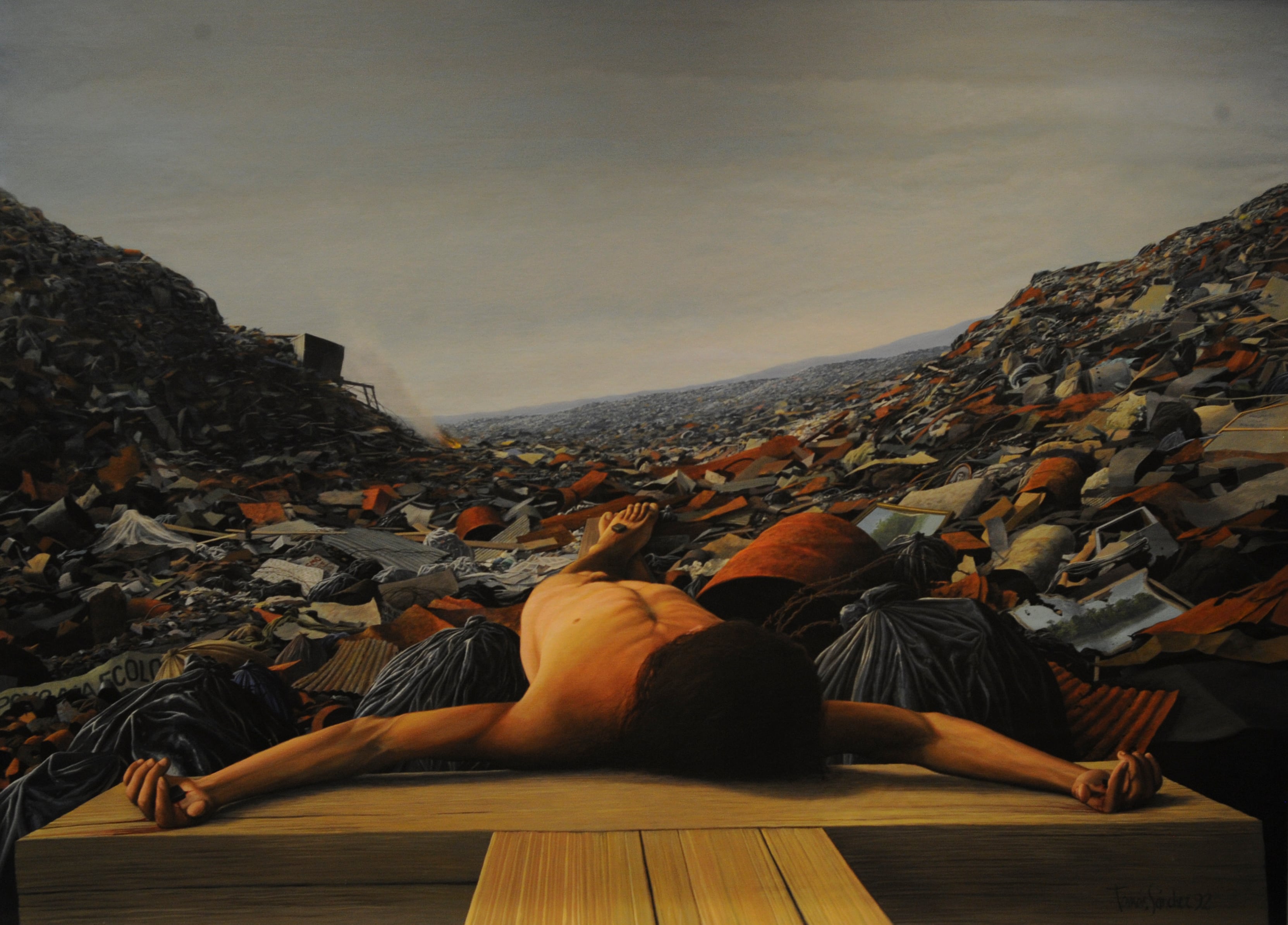 A Tomás Sánchez hay que entenderlo como dualidad. Basura y natura son dos complementarias. ‘Si tú me pones a pintar paisajes nada más, exploto. Si me pones a pintar basureros nada más, exploto. Al mismo tiempo, me doy cuenta de que los dos temas son paisajes. La relación ideal con la naturaleza, que el hombre contempla, disfruta y la adora, y otra relación en la que el hombre recibe el desastre, el fruto, el detrito de todo lo que consume, a veces innecesariamente’, asegura.