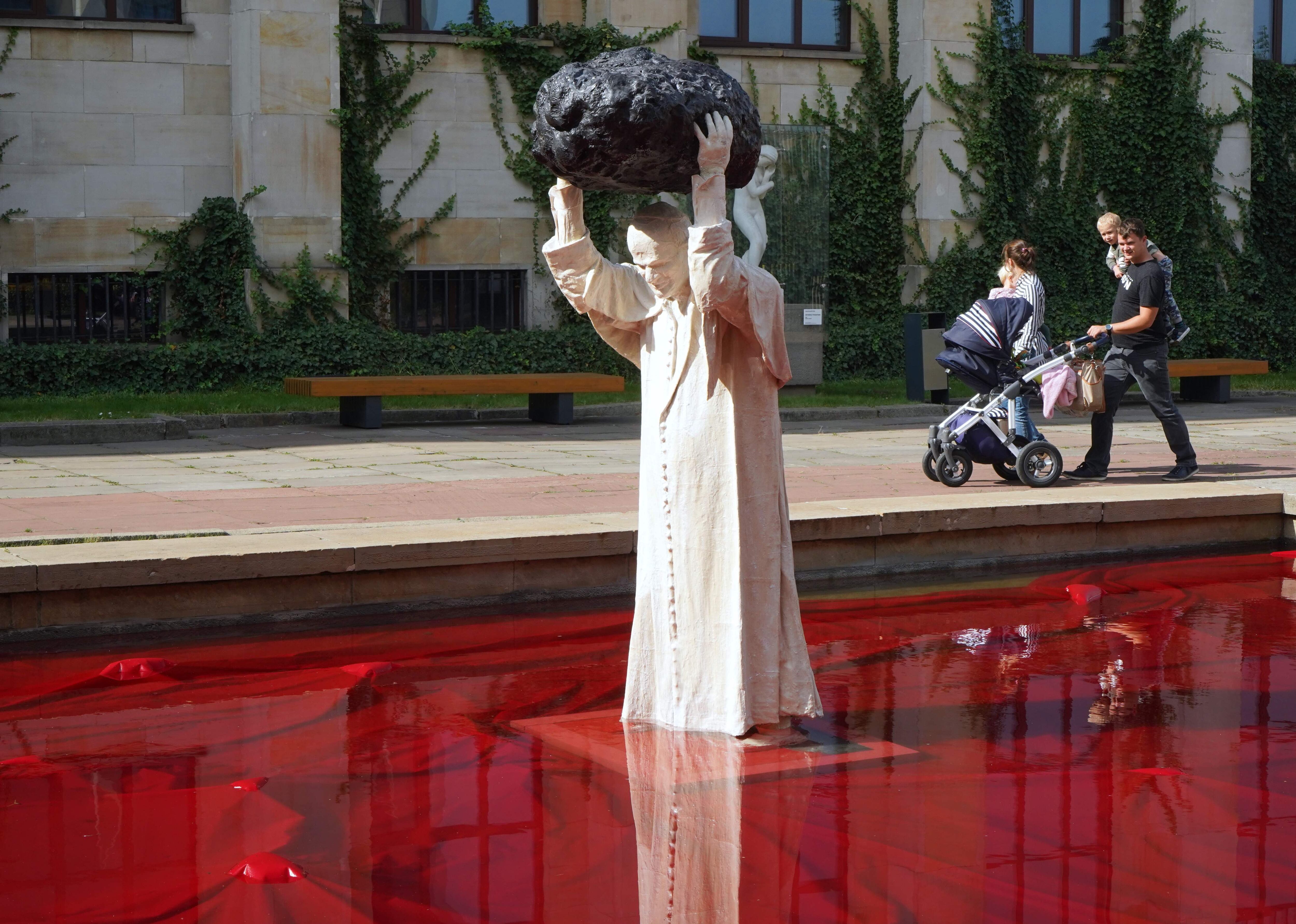 La escultura de Jerzy Kalina, colocada en la entrada del Museo Nacional, se titula Fuente envenenada y muestra al papa polaco en medio de una fuente de agua teñida de rojo, como la sangre, llevando una roca sobre su cabeza.