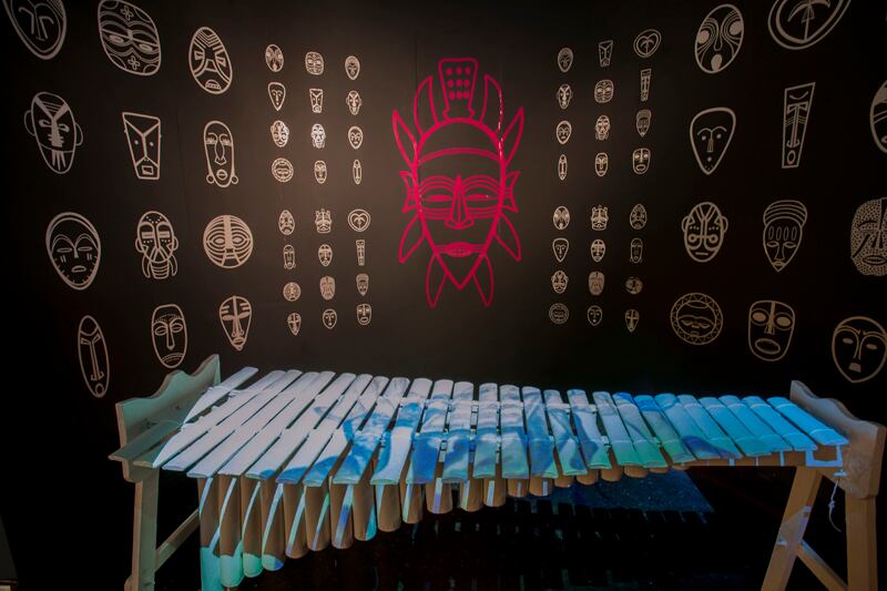 Pintadas en las paredes, las salas y las secciones exhiben bandas amarillas, azules y rojas; sus longitudes indican las “dosis” que unos objetos o unos ritmos recibieron de una cultura. Así, el rojo predomina en los objetos de la música cubana.