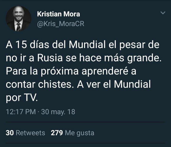 Extrañeza, desconcierto y, por supuesto, miles de opiniones en redes sociales fueron lo que provocó este miércoles un tuit del narrador estelar de Teletica Deportes, Kristian Mora, en el que se mandó con una chota pública, con evidente descontento por no integrar la numerosa comitiva que Canal 7 enviará a cubrir la Copa del Mundo Rusia 2018.
