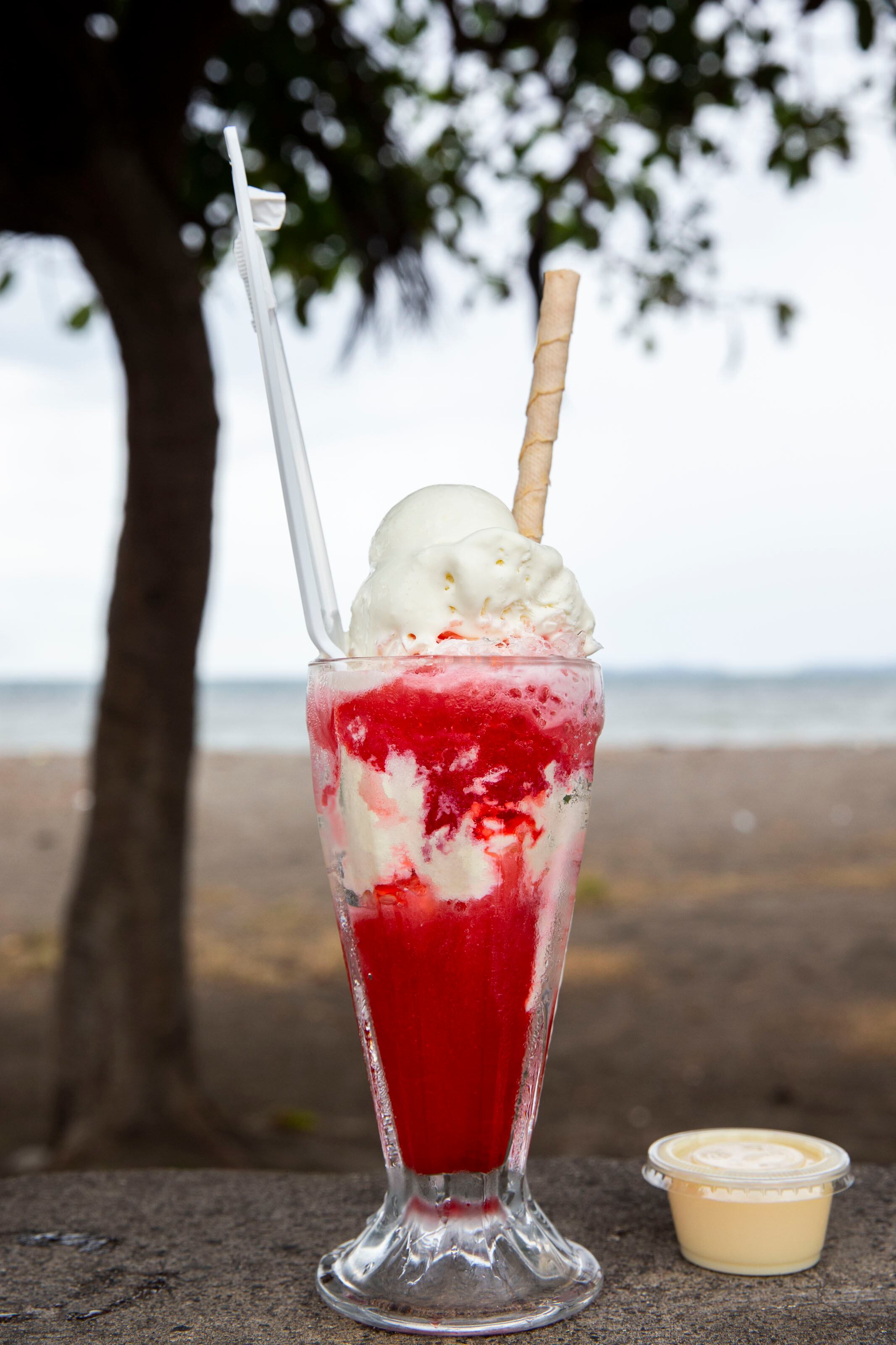 Ya bien comidos llegó el turno del postre. Aquí es donde la fiesta comienza porque el Churchill es el rey de todo. En una copa alta se sirve el hielo raspado con sirope de kola (tradicional), leche en polvo, leche condensada y una buena bola de helados encima. El precio ronda los ¢3.000.