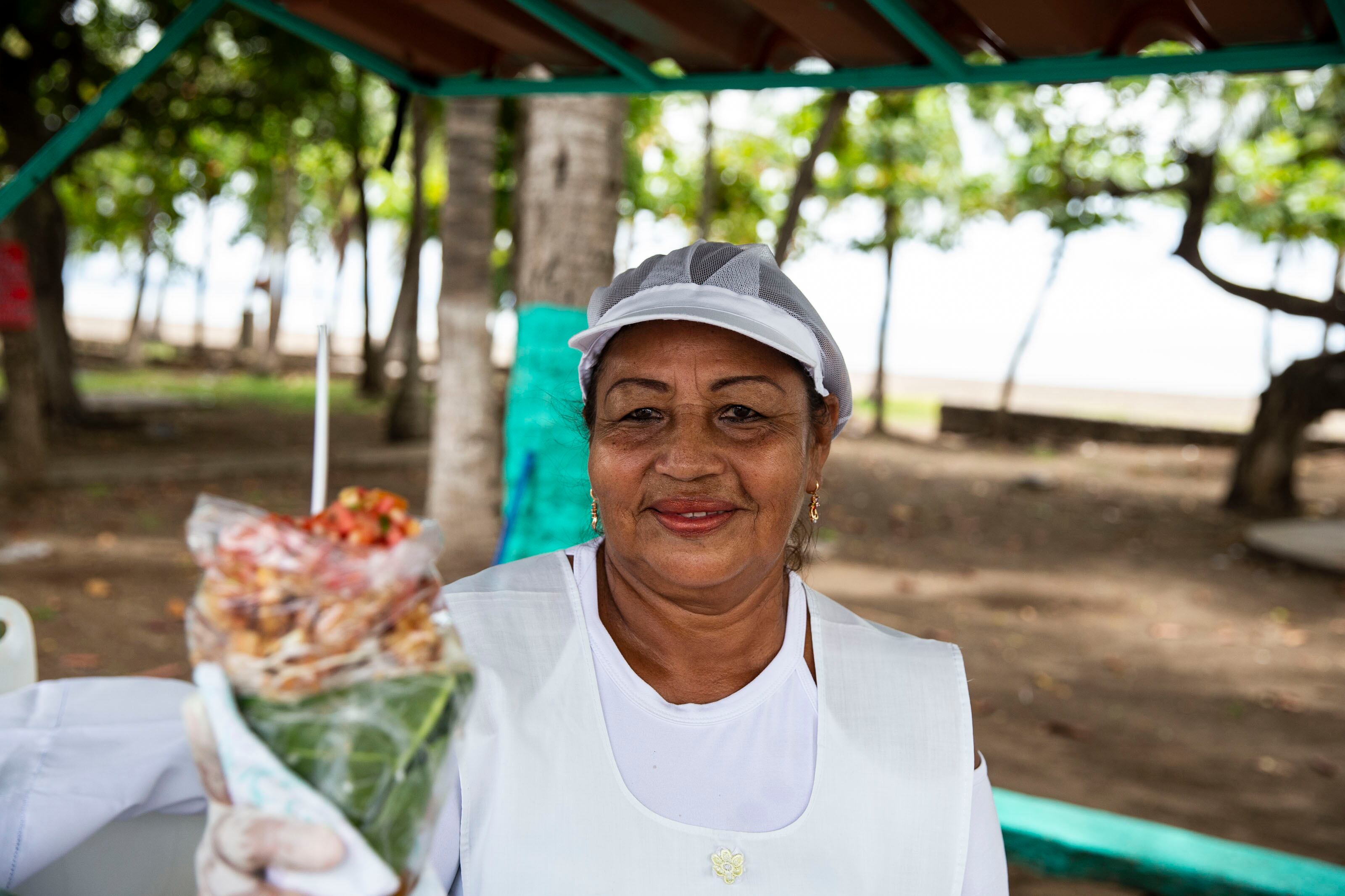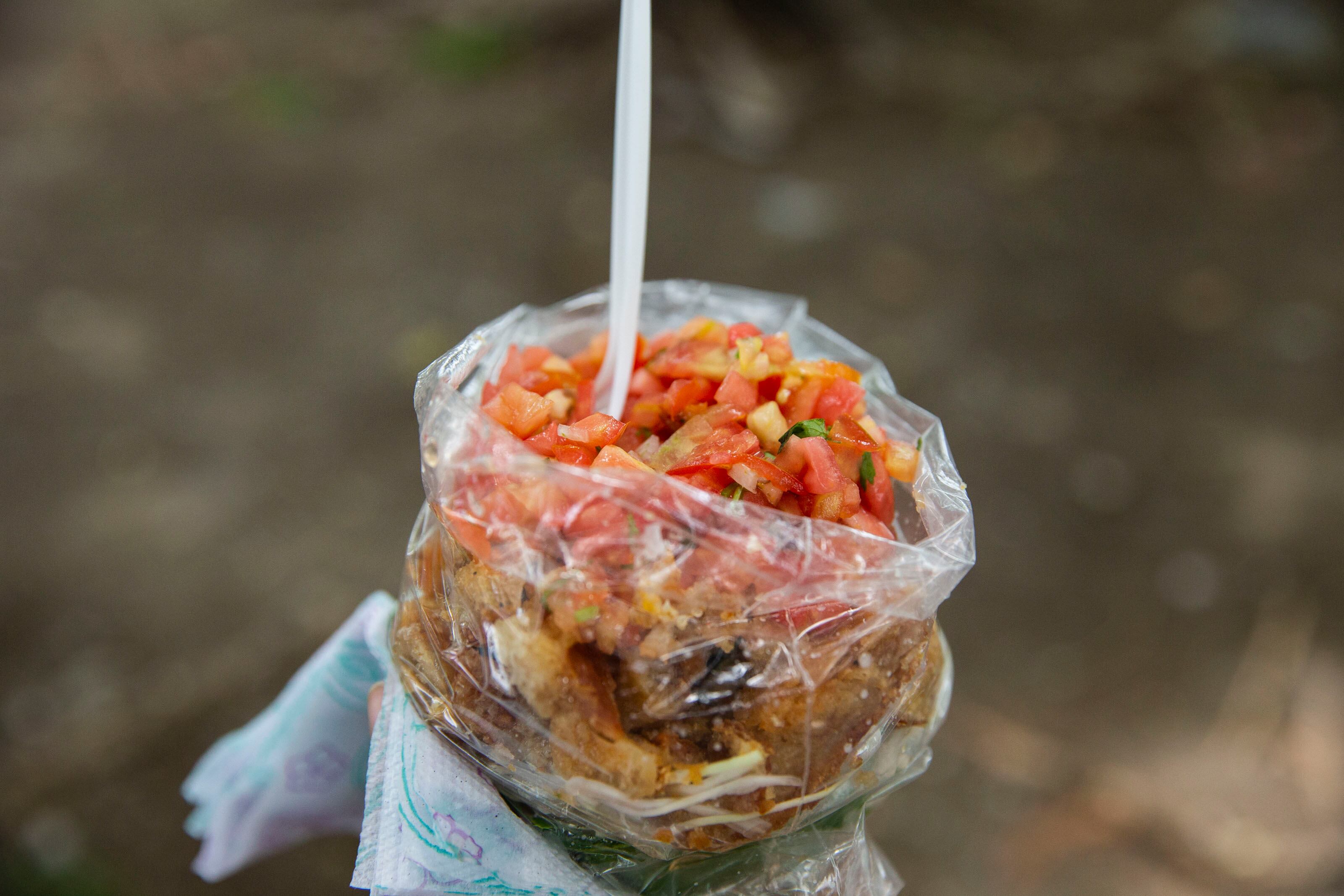 En la playa hay varias señoras que tienen sus puestos. Así encontramos a doña Marta Delgado frente al casino Corona de Oro. Esta nicaragüense con muchos años de vivir en Puntarenas aprendió muy bien la receta: en una bolsita plástica ponen un par de hojas de almendro, las llena con repollo recién picado, yuca sancochada, agrega chicharrón tostado o bien carne de cerdo y por último lo sazona con un chimichurri fresco. Por ¢3.000 queda uno bien lleno, de eso podemos dar fe.