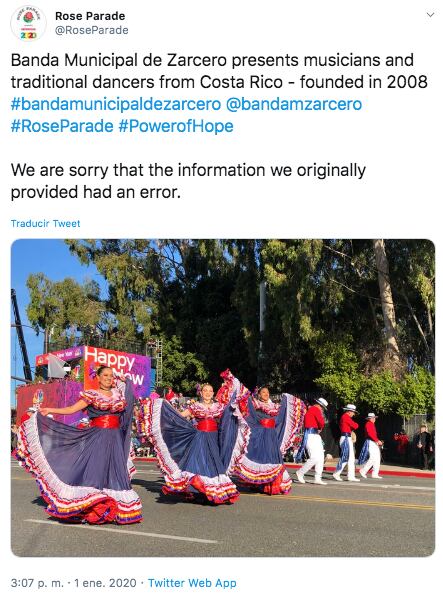 El desfile arrancó a las 8 a. m. hora en California (10 a. m. en Costa Rica) y los costarricenses aparecieron a las 10:50 a.m. en la transmisión oficial de la cadena estadounidense KTLA 5 en el marco de dos horas de evento en vivo.