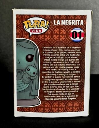 Además, detrás del empaque del coleccionable ,aparece un texto que describe la historia de la aparición de “La Negrita” en Cartago.