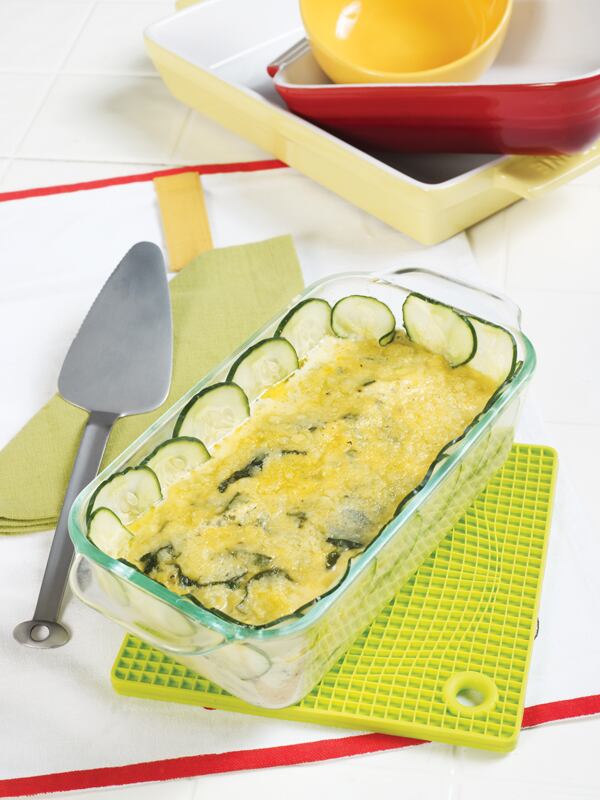 3. En un refractario rectangular mediano, coloque una capa de papas, una de espinacas y una de queso gouda. Forme 3 capas de papas, 2 de espinacas y 3 de queso; siga el orden antes mencionado. Al final, vierta el líquido distribuido por toda la cacerola.