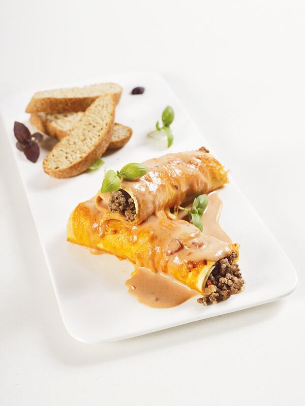 2. En un sartén mediano, coloque una cucharada de aceite, ¼ de cebolla, 1 diente de ajo y ¼ de chile dulce picados bien fino. Agregue 80 g de carne molida y cuando esté cocinada, rellene las 4 láminas de pasta fresca ya precocinada, forme los canelones y colóquelos en un refractario junto con la salsa aurora. Esparza 80 g de queso mozzarella rallado y lleve al horno para gratinar.