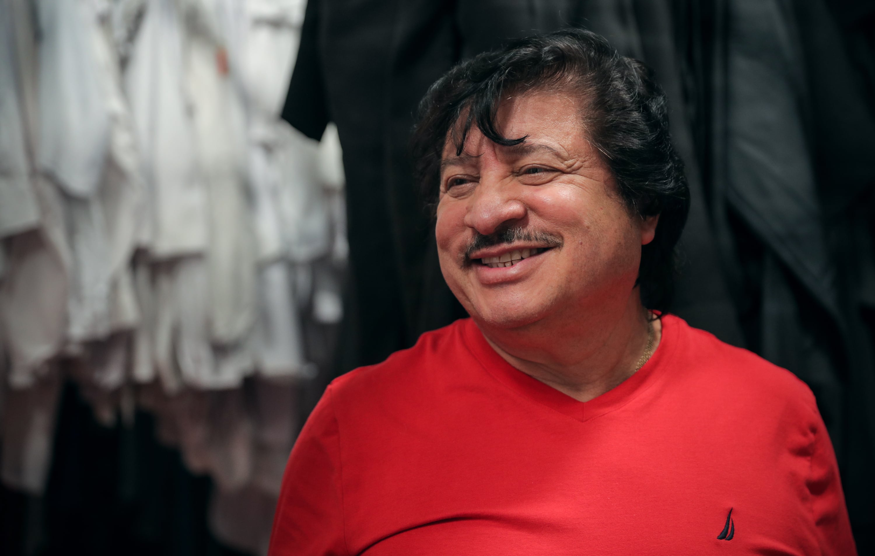 Basta con que alguien se acerque a pedirle una foto para que se transforme: sus ojos brillan y su sonrisa se extiende por su robusto rostro.