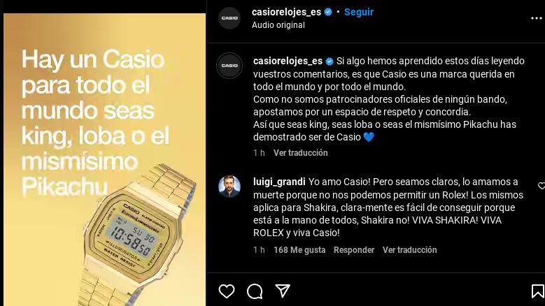 “Hay un Casio para todo el mundo seas king, loba o el mismísimo Pikachu. Por eso no somos patrocinadores oficiales de ningún bando”, es el mensaje que la marca japonesa publicó en sus historias en Instagram.
