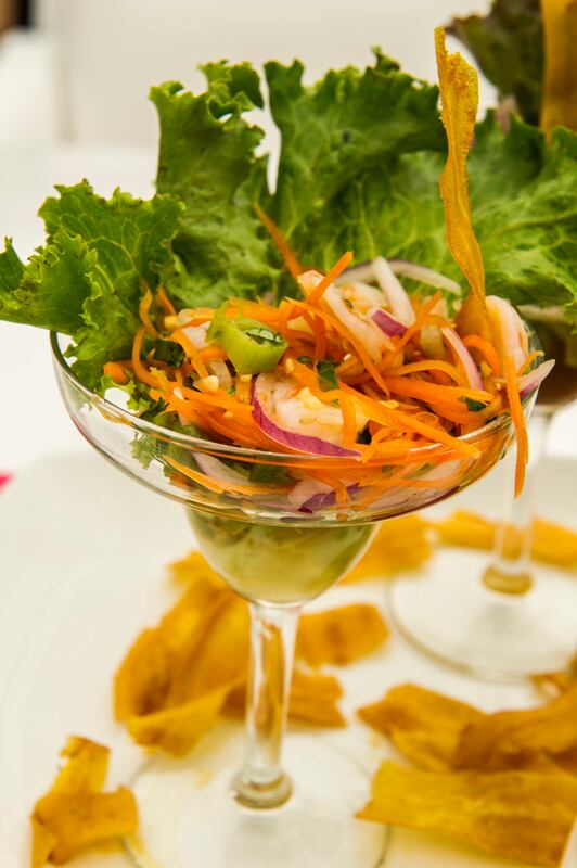 Ponga la miel del vinagre en una copa para margarita y coloque la zanahoria rallada con pelador. Aparte, cocine los camarones por tres minutos en un poco de agua con sal, un ajo y una hoja de laurel. Saque y coloque en la mezcla de la zanahoria. Añada la cebolla en tiras, el chile dulce. Sirva con media cucharadita de maní triturado.