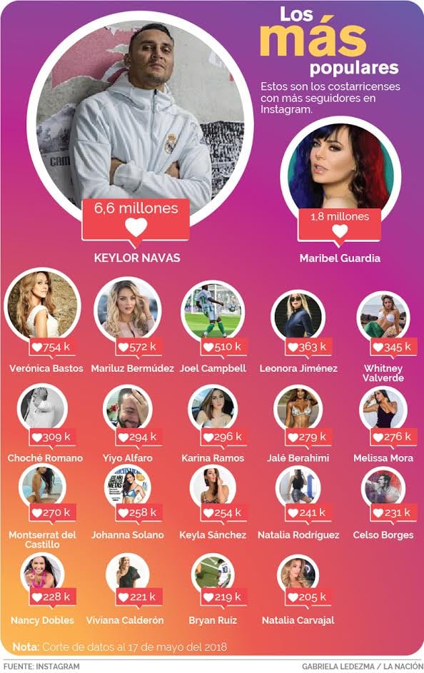 Quizá esos sean motivos suficientes para que quienes integran el top 22 de los ticos más seguidos (según una lista que se realizó para este trabajo tras descubir que no existe una formal), cuenten con miles de seguidores, comentarios y muchos likes. También está el aspecto comercial, por el cual muchos de ellos reciben dinero a cambio de los posteos que comparten para promocionar productos.