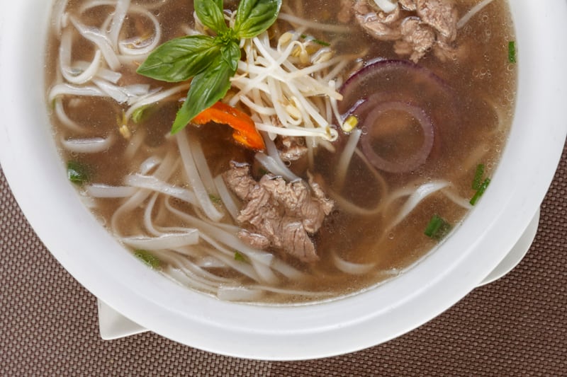 Los fideos de arroz son el ingrediente más ligero. Complementan a los tiernos cortes de carne de lomito que emergen entre el delicado sabor del caldo.