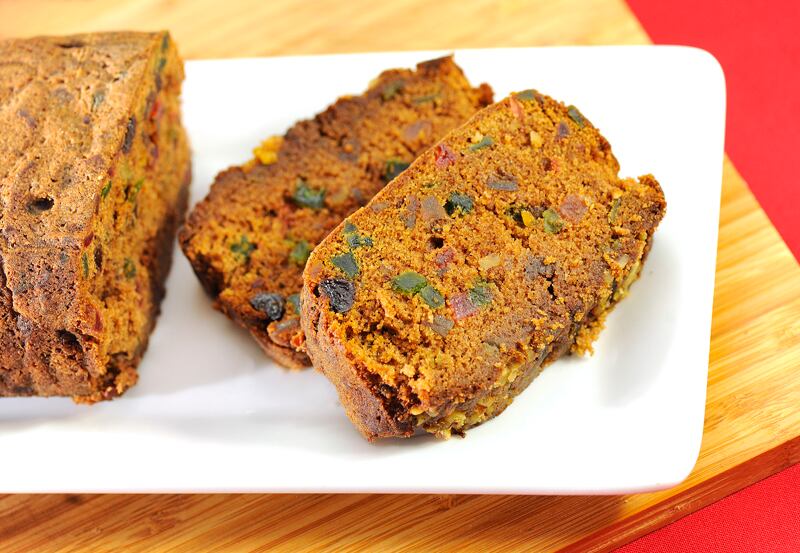 Ingredientes: Una taza de pasas, una taza y media de fruta confitada ralladura de limón y naranja, un cuarto de taza de jengibre confitado, una taza de ron dorado, una taza de azúcar, 140 gramos de mantequilla, una taza de néctar de manzana, cuatro clavos de olor molidos, una cucharadita de canela molida, una cucharadita de jengibre molido, una taza y tres cuartos de harina, una cucharadita y media de sal, una cucharadita de bicarbonato, una cucharadita de polvo de hornear, dos huevos y un cuarto de taza de nueces.