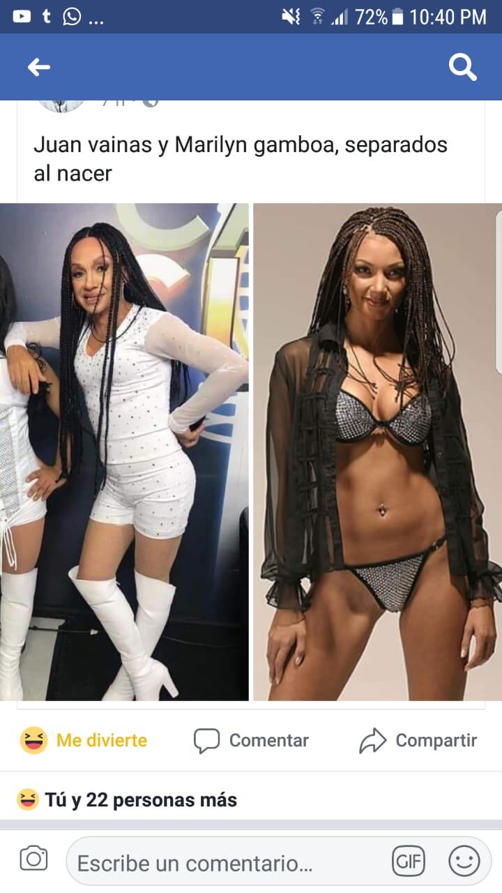 Por supuesto, los memes que empiezan a circular después de cada programa son parte del vacilón, uno de los más ingeniosos fue el que alguien armó tras la presentación de Juan Vainas el domingo pasado en el papel de Natti Natasha, pues compararon la foto del cómico caracterizado como la reguetonera (impresionante, por cierto) con otra de la escultural presentadora y empresaria Marilin Gamboa, bajo el título “Separadas al nacer”.
