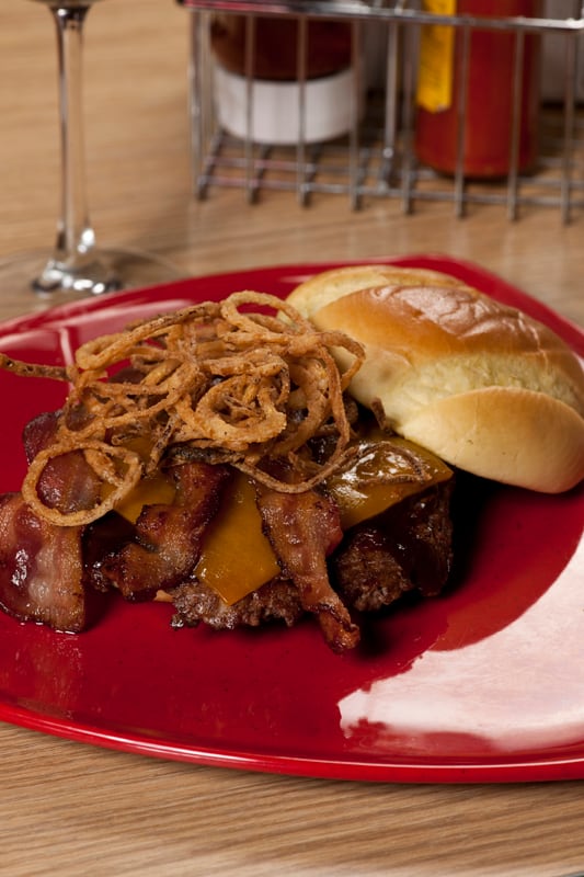 En un plato grande, ponga las rebanadas de pan y coloque la torta de carne, el queso Cheddar y los aritos de cebolla. Por último, agregue salsa BBQ al gusto.