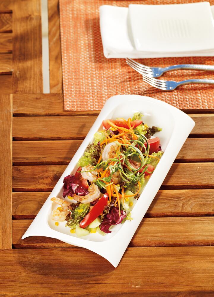 Vierta el aderezo sobre la ensalada, mezcle y sirva inmediatamente.
