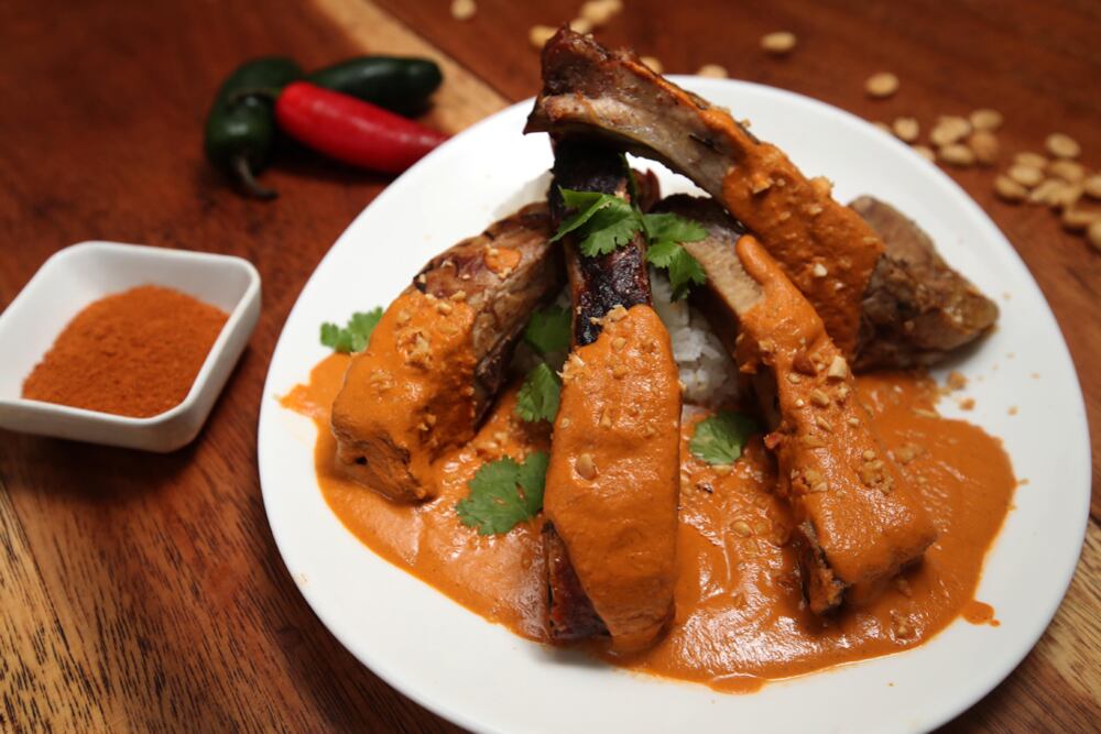 Una sabrosa costilla de cerdo al horno con salsa de tomate, cebolla y ajos rostizados aromatizados con comino, pimienta negra y cacahuate (maní) frito, se servirá en Keidas Lounge.