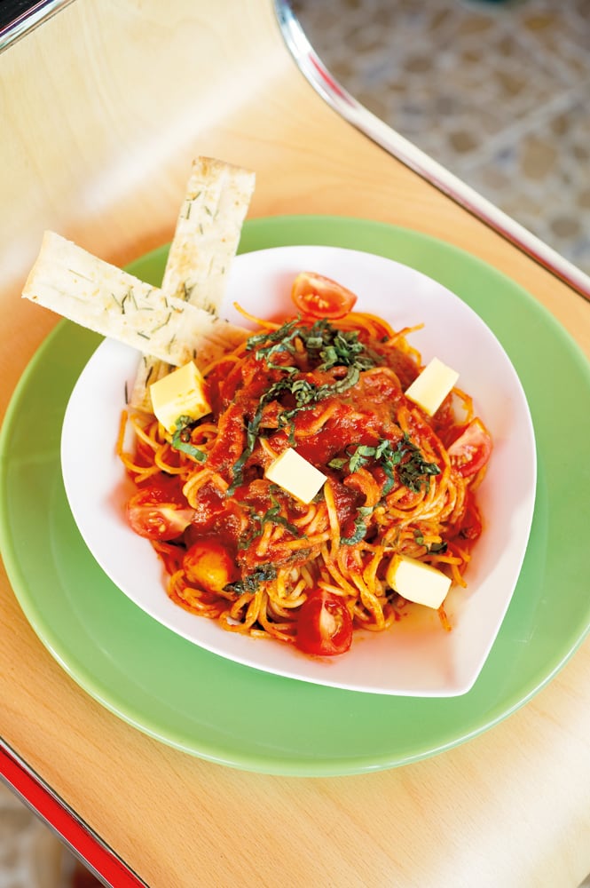 5. Sirva con la pasta, añada los cuadros de queso mozarela y decore con albahaca y tomate cherry.