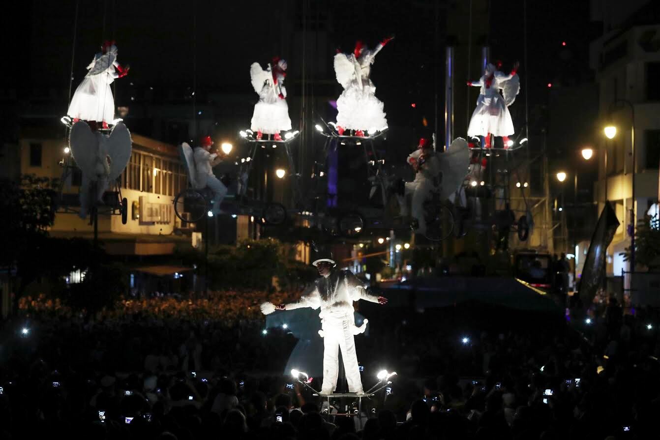 La grúa del espectáculo elevó el mecanismo y, sobre una pantalla circular, un proyector iluminaba imágenes de sitios de San José. El gran final del espectáculo fue en el aire: una acróbata suspendida viajó sobre las cabezas del público mientras llovía confeti, plumas y, con un sonoro estruendo, una lluvia de fuegos artificiales.