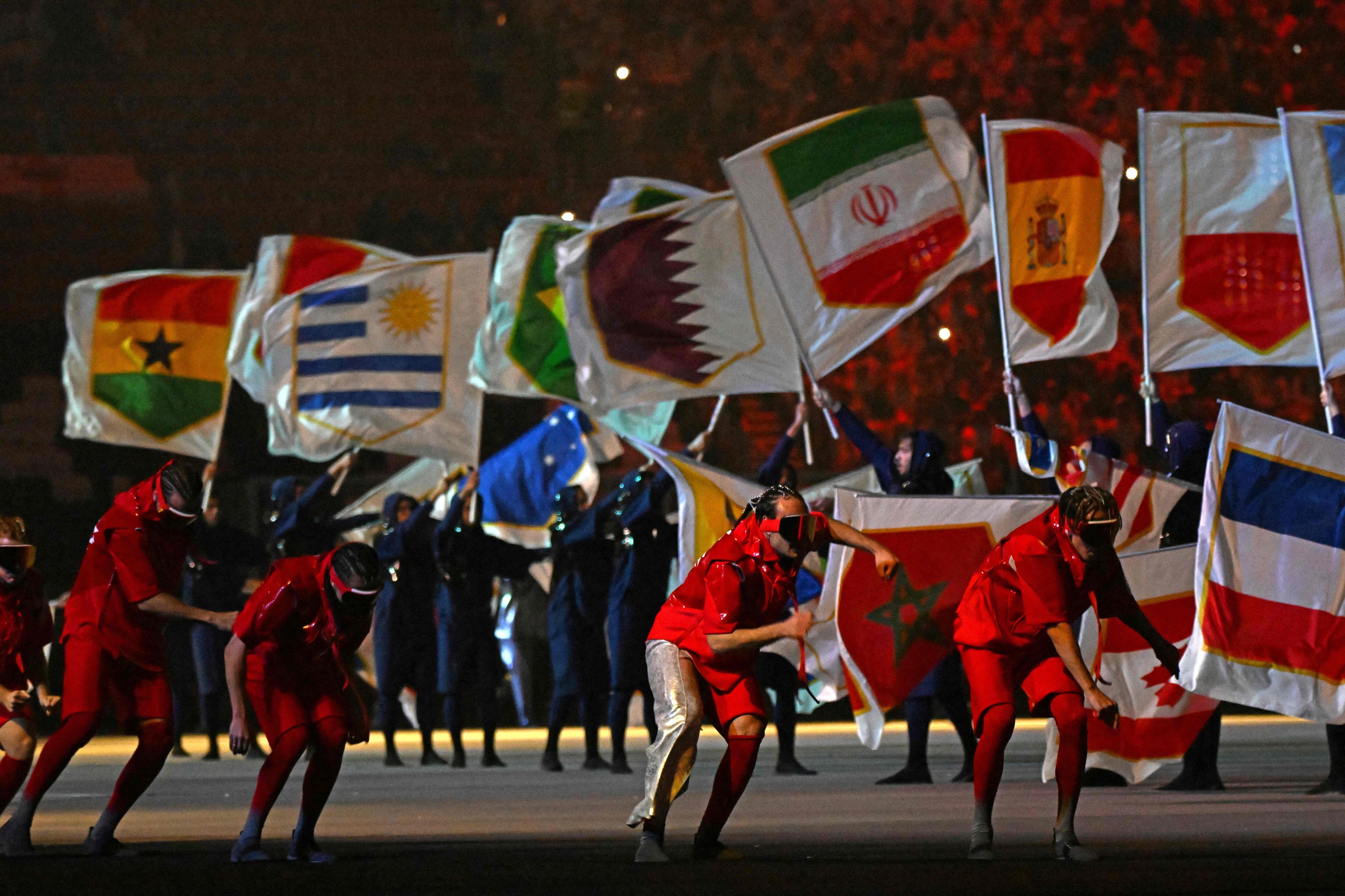 Las emociones que ya habían generado Freeman y Ghanim al Muftah se elevaron al doble cuando decenas de personas empezaron a desfilar por el estadio, cada una cargando una de las 32 banderas de los países que competirán por la Copa del Mundo. FIFA había adelantado que, durante el evento, se haría un homenaje a cada una de las selecciones.