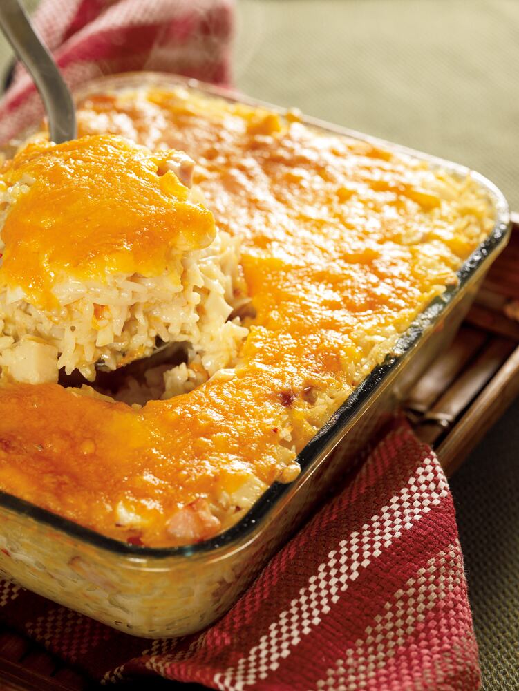 3. En un recipiente para horno, coloque una capa de arroz. Luego, coloque parte del pollo y del jamón. Bañe con la mitad de la salsa, repita. Termine con un capa de arroz y luego bañe con la taza de salsa reservada.
