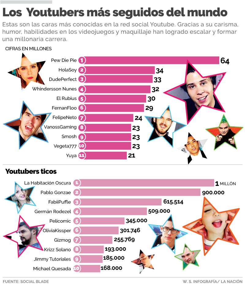 Si es así, le informo que estas son las estrellas que cimentaron su meteórico ascenso en una red social llamada YouTube. Esta selva ha cambiado mucho desde su lanzamiento hace 13 años, que lo diga el sueco Felix Arvid Ulf Kjellberg, mejor conocido bajo el pseudónimo de PewDiePie, el escandinavo que ha logrado juntar una masa de seguidores de 64 millones; eso es como si todos los habitantes de Centroamérica y Panamá se pusiera de acuerdo para seguir a este canal.