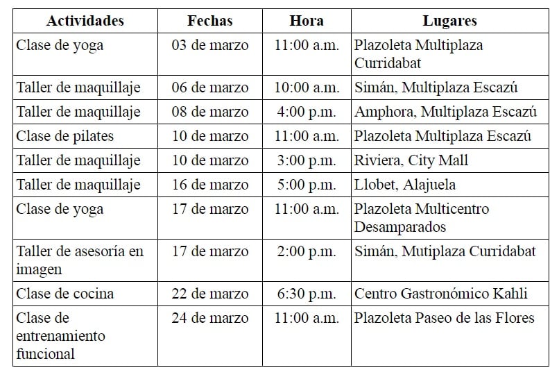 En marzo esa campaña dará inicio en Costa Rica, por lo que, la marca realizará clases de yoga, pilates, ejercicios funcionales y cocina; también talleres de maquillaje y asesoría en imagen. Todas las actividades son gratuitas y podrán aprovecharse a lo largo del mes.