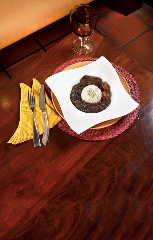 2. En un sartén con aceite, sofría la cebolla, dientes de ajo finamente picados y chile morrón hasta que se cristalicen. Luego agregue la morcilla y el chorizo. Cocine por 2 minutos, luego le añade al guiso con un poco de sal, cayena y los frijoles. Pruebe la sazón.