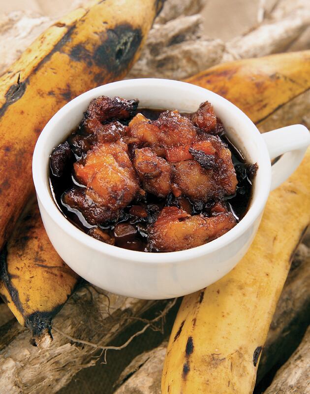 Ponga una olla y precaliente un poco, agregue el azúcar y con una cuchara de madera revuelva lentamente. Añada la cáscara de limón, la canela, la piña, la cáscara de piña y mezcle bien cuando el azúcar empiece a caramelizar, agregue el agua y revuelva bien hasta que se haya hecho un almíbar, luego agregue los plátanos y deje reposar 5 minutos a fuego bajo.