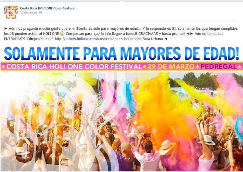 Los menores de edad que invirtieron entre ¢23.500 y ¢30.000 para disfrutar de la música y la explosión de colores en el festival Holi One, que se realizó el sábado, se quedarán con las manos vacías, pues la producción de la actividad no les reintegrará el costo de los boletos.