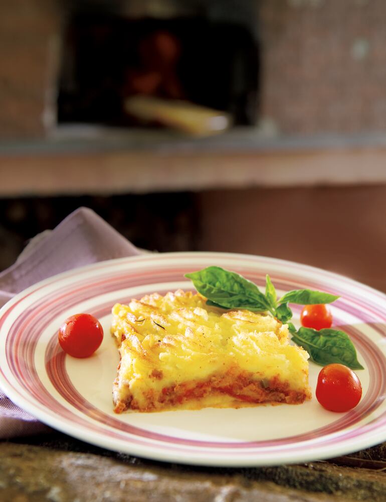 1. Engrase con manteca un refractario de 10x25 cm. Coloque una primera capa de puré y luego una capa del relleno de carne. Finalice con una capa de puré. Lleve al horno durante 15 minutos a una temperatura de 300°F (150°C). Rocíe el queso Bagaces y dore.