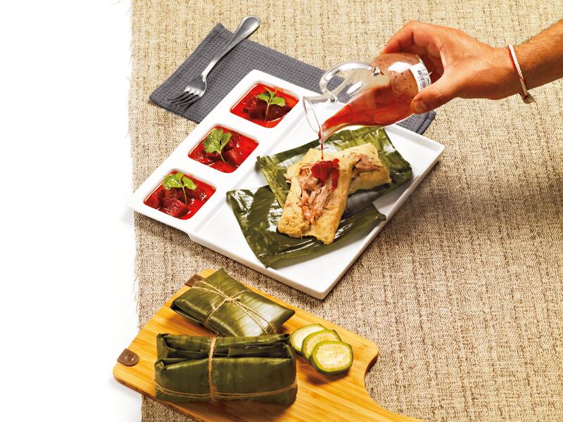 2. Coloque las hojas de plátano y rellene con media taza de guineo, coloque dos cucharadas de cerdo desmechado en el medio y cierre el tamal de forma tradicional.