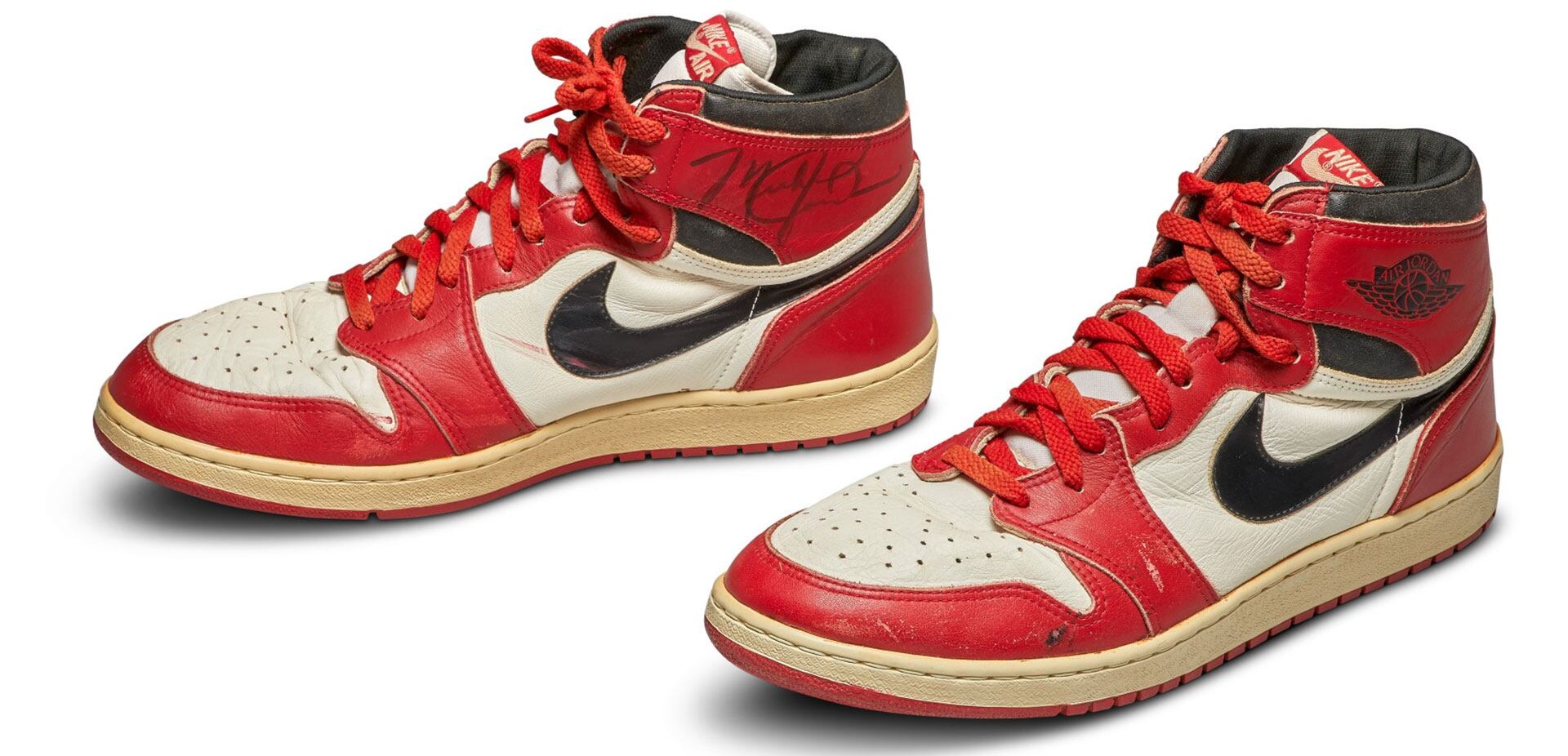Las zapatillas blanca, negras y rojas, fabricadas para Jordan en 1985 y autografiadas por la leyenda de la NBA, destronaron a un par de Moon Shoe, que se vendió en julio de 2019 por $437.000 dólares, también en Sotheby’s.