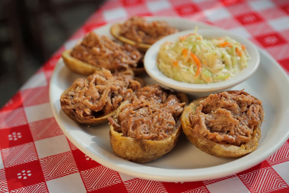 “Son unas deliciosas cáscaras de papa rellenas de carne de cerdo mechada preparadas con la famosa salsa de JR Jow´s Ribs. Se sirve con ensalada tipo coleslaw ”, explicó Bryan Vega, chef del lugar.