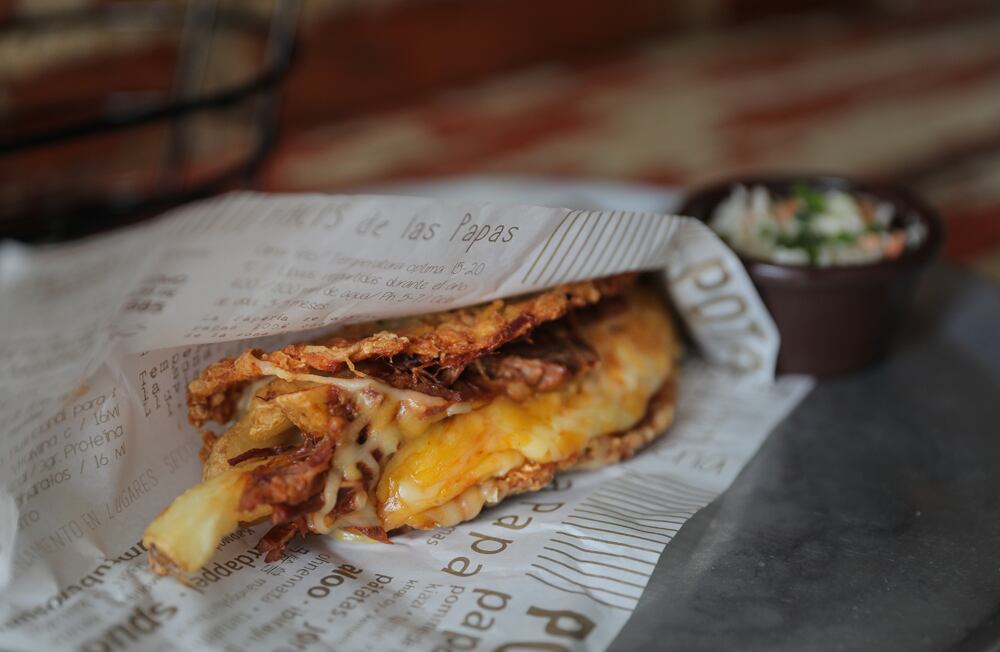 Esta creación consiste en un taco tico con carne mechada. La sorpresa del platillo de La Papería se encuentra en su tortilla: es elaborada con papas congeladas.