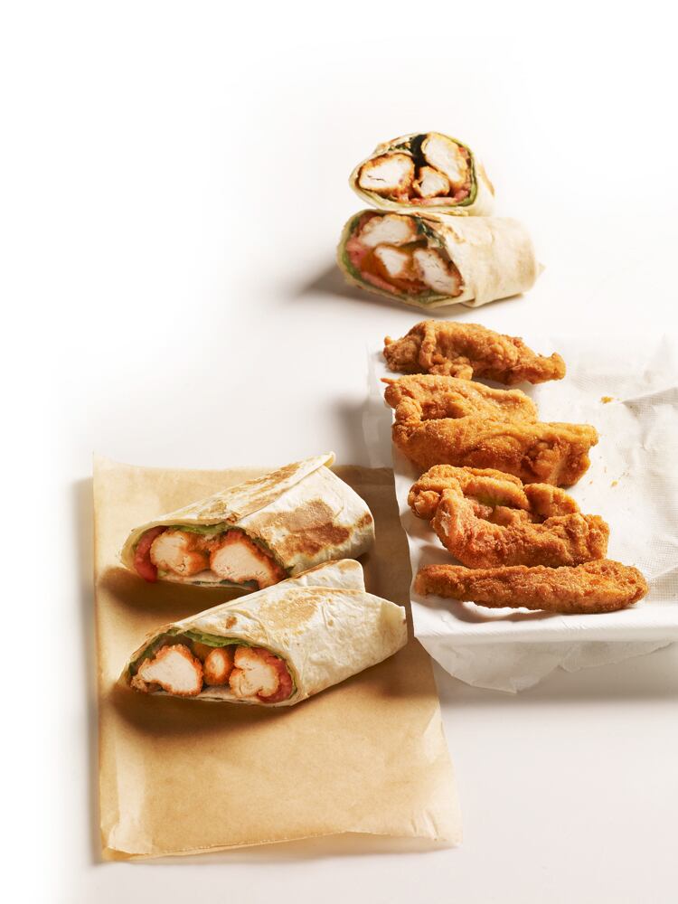 2. Caliente cada tortilla de trigo en un sartén. Rellene poniendo encima una cucharada de mayonesa, unas piezas de pollo, albahaca picada y rodajas de tomate, y aderece con limón, aceite de oliva, sal y pimienta. Enrolle como un wrap y sirva.