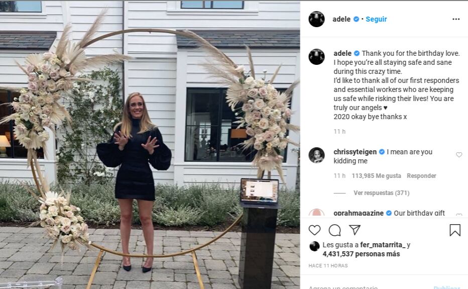 Adele aprovechó el festejo para compartir en la red social, en la cual cuenta con más de 33 millones de seguidores, una fotografía en la que se le ve feliz por su cumpleaños, pero además muestra su enorme transformación física.