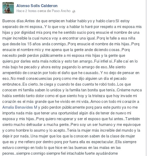 El músico y exjugador de fútbol Alonso Solís ofreció una disculpa pública a su esposa Amalia Benavides, después de cometer una infidelidad, que provocó la separación de la pareja.