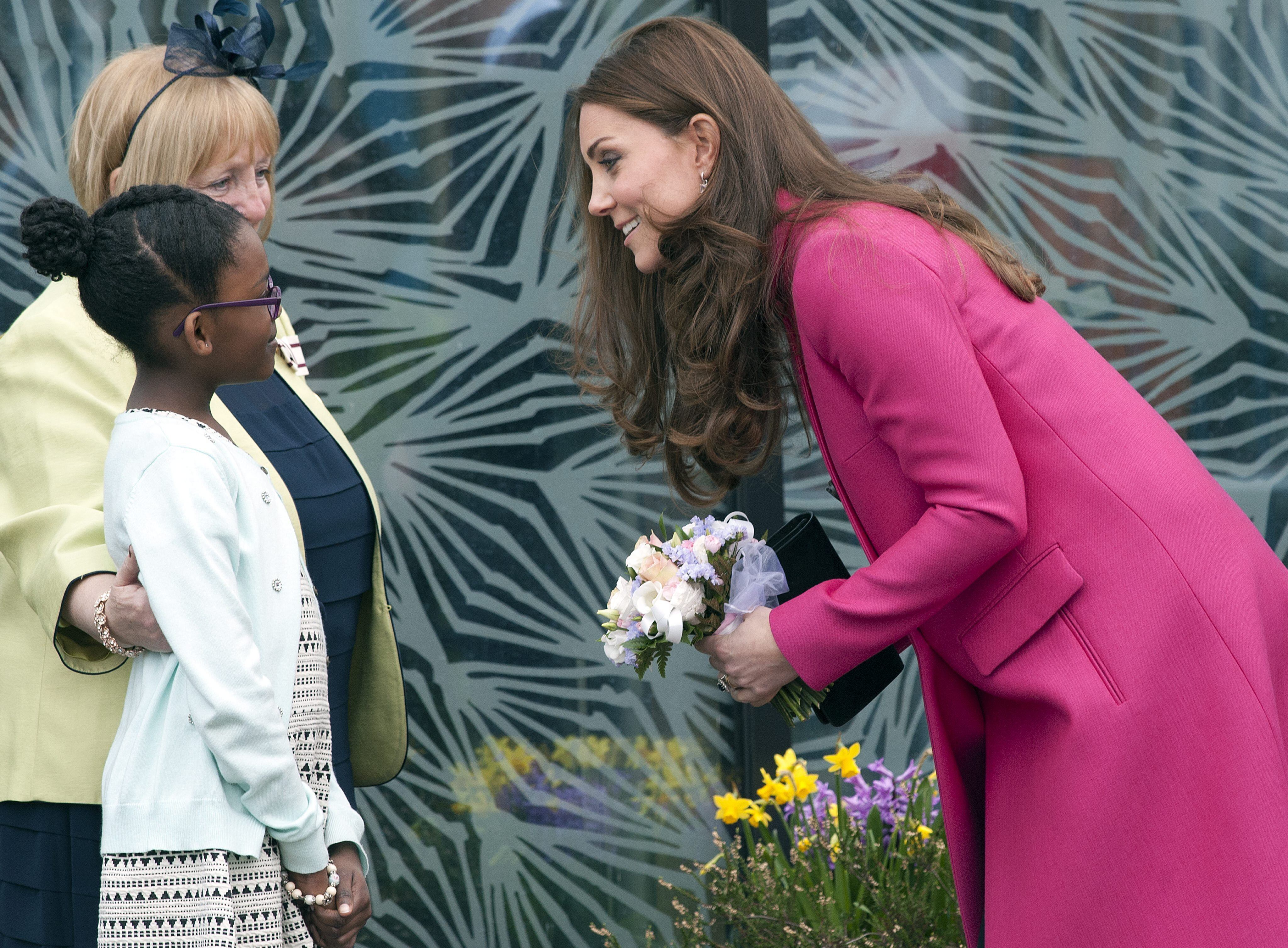 La duquesa de Cambridge, que lució un elegante abrigo fucsia de la firma Mulberry, estuvo acompañada por Doreen Lawrance en una visita guiada por las instalaciones del centro.