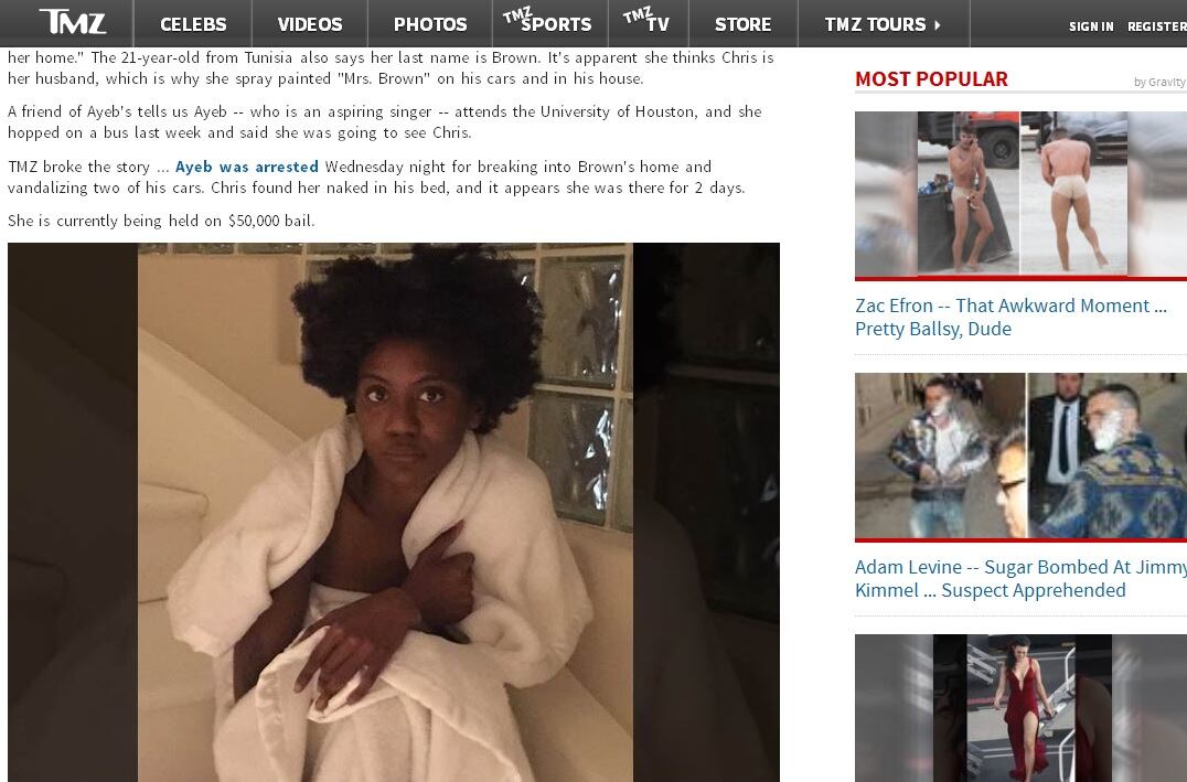 El rapero estadounidense Chris Brown encontró una joven admiradora desconocida que había entrado en su casa, le sacó una fotografía en la que esta sale cubierta solo con una toalla y la colgó en Instagram.