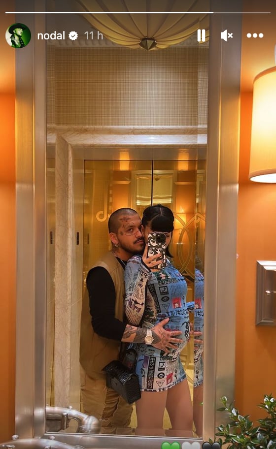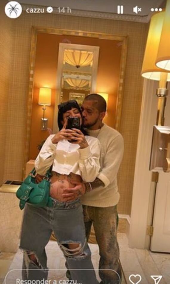 A través de sus historias de Instagram, los cantantes compartieron un par de fotografías, desde el hotel en el que se hospedan. En las imágenes se puede ver a Julieta posando frente al espejo de un elevador, mientras que el cantautor se encuentra atrás de ella, besando su mejilla y acariciando su vientre.