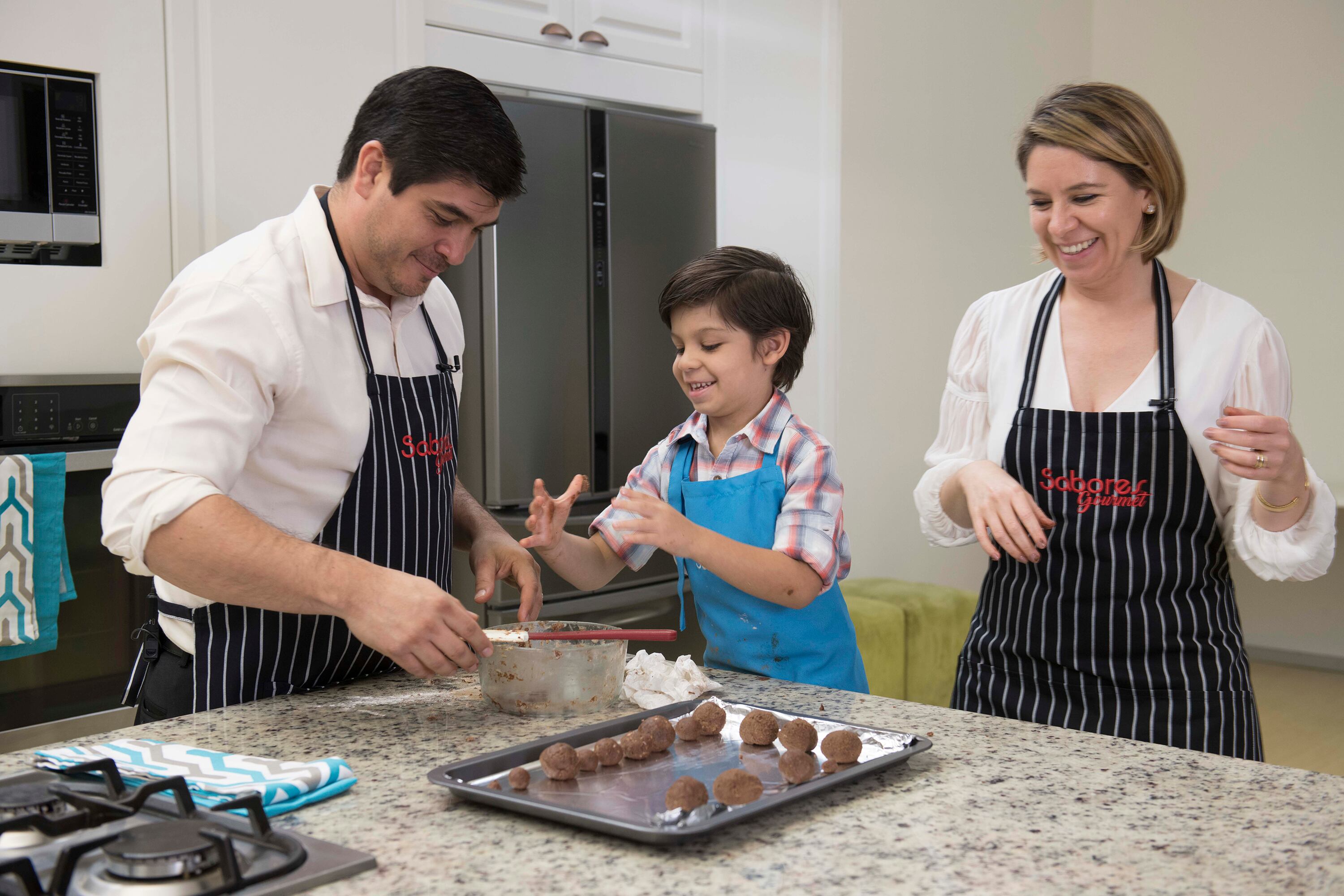 El primer chef de la velada fue Gabriel. Bajo la guía de sus padres y sin ninguna duda de lo que hacía, el niño fue mezclando la harina y el chocolate, pero en un instante toda su atención se posó en la mantequilla.