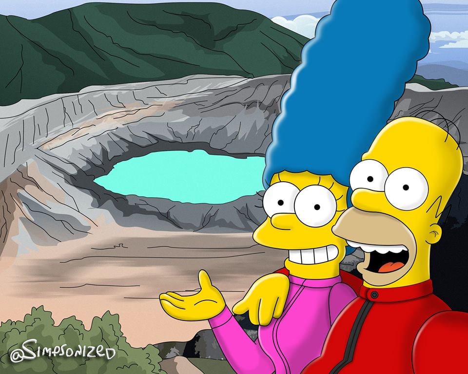 Marge, Homero, Lisa, Maggie y Bart estuvieron de visita en nuestro país, de una manera atípica, ya que los famosos personajes de la televisión disfrutaron de las bellezas de Costa Rica gracias al talento y la mirada de los dibujantes venezolanos Isaac y Nelson Tiapa, de la página web Simpsonized, que se dedica a hacer caricaturas de la familia amarilla en una versión tipo fan art.