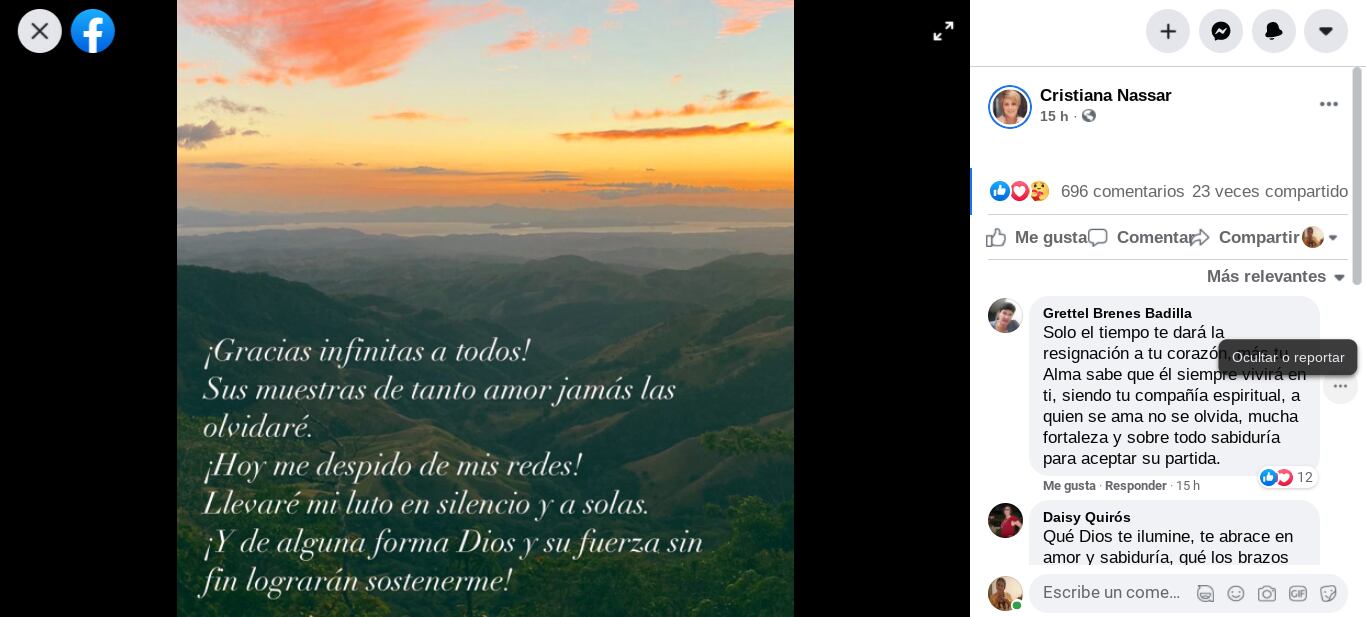 “¡Gracias infinitas a todos! Sus muestras de tanto amor jamás las olvidaré. ¡Hoy me despido de mis redes! Llevaré mi luto en silencio y a solas. ¡Y de alguna forma Dios y su fuerza sin fin lograrán sostenerme!”, así explicó la presentadora de televisión Cristiana Nassar su decisión de alejarse de las redes sociales para llevar en la intimidad el luto por el fallecimiento de su esposo Martín Nassar.