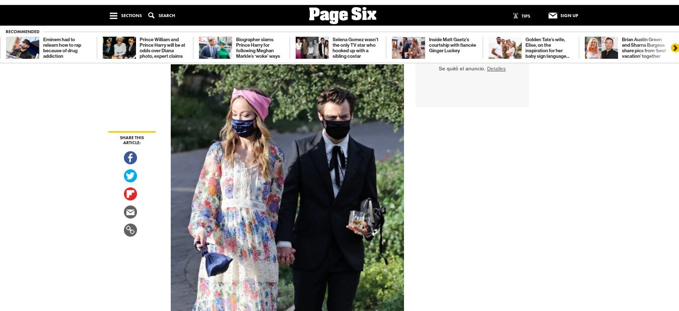 En otra publicación, Page Six confirma que el presentador de televisión James Corden le había ayudado a la pareja a mantener su romance en secreto, incluso se dice que los hospedó en su casa mientras trabajaban en la grabación de la película. En la misma nota aseguran que una fuente cercana a la pareja confirmó que Harry presentó a Olivia con sus amigos como su novia y que durante el evento se besaban sin preocupaciones en frente de todos.