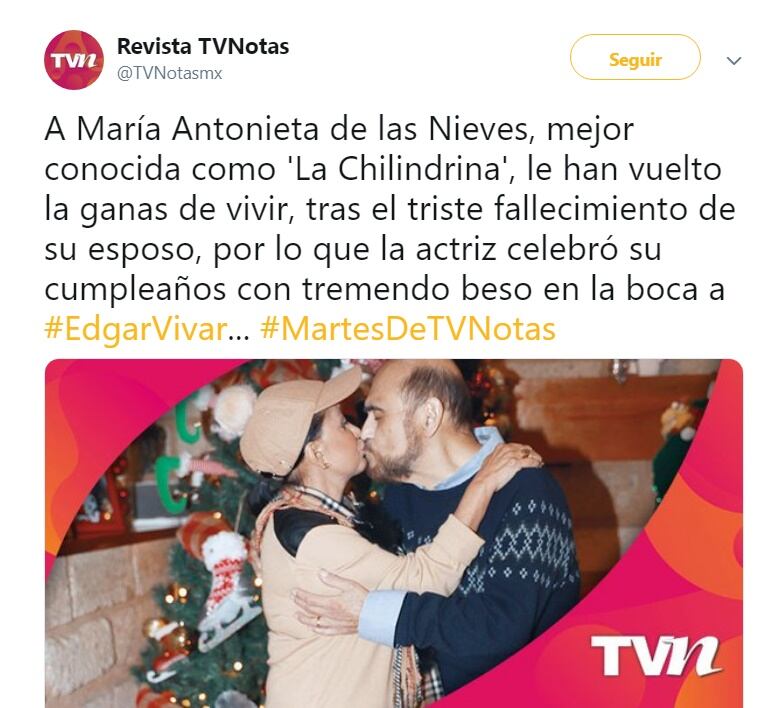 La imagen fue compartida por la revista TV Notas en su cuenta oficial de Twitter. “A María Antonieta de las Nieves, mejor conocida como La Chilindrina, le han vuelto las ganas de vivir, tras el triste fallecimiento de su esposo por lo que la actriz celebró su cumpleaños con tremendo beso en la boca a Édgar Vivar”, se lee en el comentario.