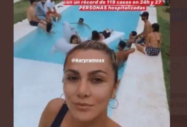 Fueron minutos lo que demoró alguien en hacerle un pantallazo a uno de los videos, en el que se apreciaba Karina en primer plano y, atrás, un molote de gente en la piscina (unas 10 personas) justo dos días después de que el ministro de Salud, Daniel Salas, decretara el endurecimiento de medidas y el regreso de parte del país a la fase 2, en vista del aumento de casos de pacientes con el nuevo coronavirus.